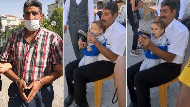 Aksaray’da köy düğününde ağzında emzikli 2 yaşındaki torununu kucağına alan dede, torununun eline tutuşturduğu silahı ateşledi. Torununa silahla ateş ettirdiği görüntüleri sosyal medyada “Şimdiden alışıyor koçum” sözleriyle paylaşan şahıs gözaltına alındı.