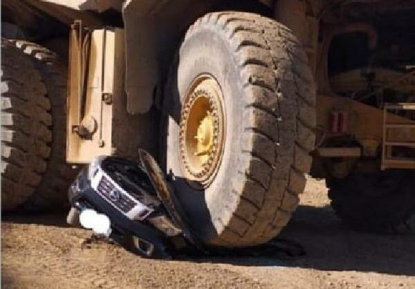 Kütahya’nın Tavşanlı ilçesindeki bir maden sahasında dev iş makinesi park halinde ve içinde kimsenin olmadığı bir kamyoneti adeta kağıt gibi ezerek, üzerinden geçti. Kazada yaralanan olmazken, kamyonet kullanılmaz hale geldi.