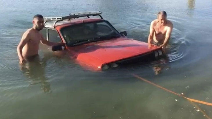 Niğde’de el freni çekilmeyen otomobil, gölette uçtu. Otomobil daha sonra traktöre bağlanan halatla çekilerek sudan çıkarıldı.