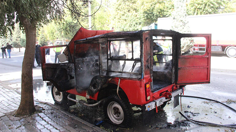Yangın, saat 12.15 sıralarında Kazım Karabekir Paşa Mahallesi Şehit İsa Kahraman Caddesi üzerinde çıktı. Edinilen bilgiye göre, İ.K’ye ait olduğu öğrenilen park halindeki 70 AC 059 plakalı cip, bir anda tutuşarak alev topuna döndü.
