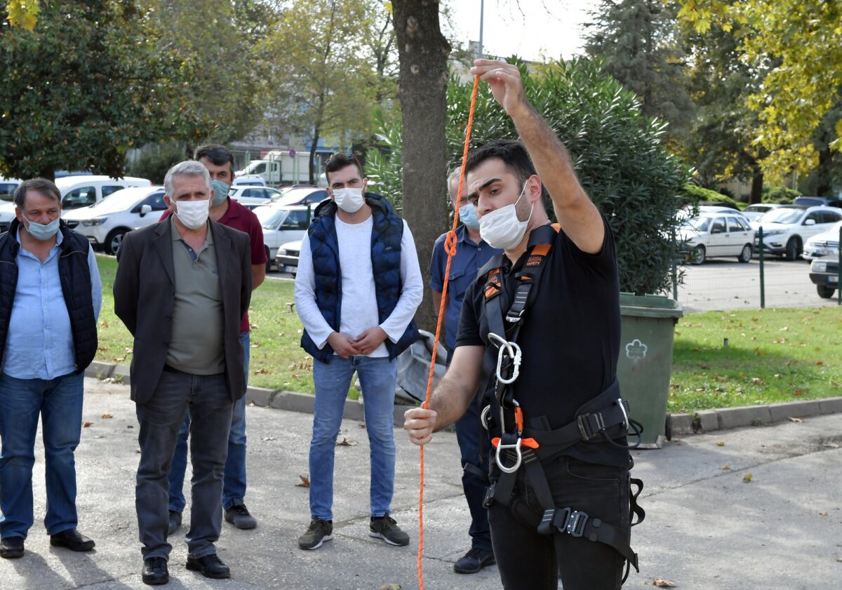 Ardından imtihana tabi tutulan personel, öğrendikleri bilgileri açık alanda uygulama imkânı buldu. Sosyal mesafe ve hijyen kurallarına uygun şekilde gerçekleşen eğitimde, belediye personeli yüksekte emniyetli şekilde çalışmanın inceliklerini öğrendi.