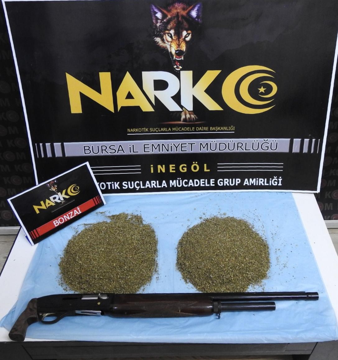 İnegöl’de bir evde uyuşturucu satışı yapıldığını ve yüklü miktarda uyuşturucu madde getirildiğini tespit eden ekipler operasyon için düğmeye bastı. Evde yapılan aramalar neticesinde 1 kilo 96 gram bonzai ve 1 adet ruhsatsız av tüfeği ele geçirildi. Evde bulunan şüpheli D.K. yakalanırken, olay ile ilgilisi olduğu tespit edilen O.Ç. ve S.Ç. aranıyor.