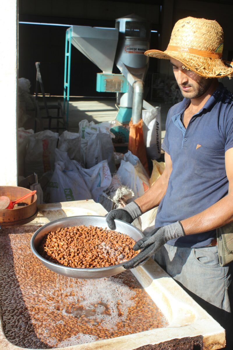Köylüler, ellerinde metrelerce uzunluğunda sırıklarla boyları 5 ila 25 metreyi bulan çam fıstığı ağaçlarına adeta bir atlet gibi tırmanarak ölümü göze alıyor. Köylüler fıstıkları ağaçlardan düşürüyor. Düşürdükleri kozalakları ise uzun arayışlar sonunda yerden bularak çuvallara topluyorlar.