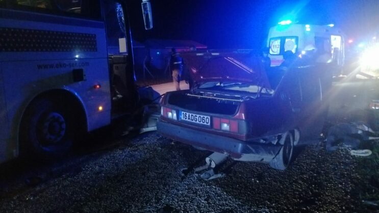 Savrulan otomobil karşı şeride geçerek Onur G. (37) yönetimindeki 16 S 6195 plakalı servis otobüsü ile çarpıştı. Çarpışmanın etkisiyle otomobil ikiye ayrıldı. Kazada araçta bulunan Fatih Akyol olay yerinde hayatını kaybetti.