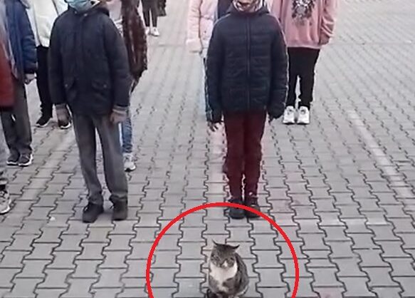 Bursa’da, Dumlupınar Ortaokulu’nun bahçesinde, öğrenciler İstiklal Marşı okuduğu sırada kıpırdamadan duran kedi dikkat çekti. O anlar cep telefonu kamerasıyla görüntülendi.