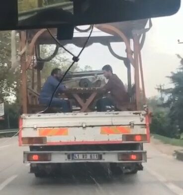 Yolda ilerleyen kamyonetin kasasındaki piknik masasında karşılıklı 2 kişinin oturduğu dikkatlerden kaçmadı. Her şey buraya kadar normal görünse de, o iki kişinin tavla oynaması “bu kadarına da pes” dedirtti.