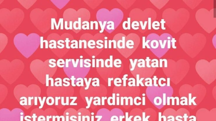 Bir kadın sosyal medya kullanıcısı tarafından grup sayfasında, “Mudanya Devlet Hastanesinde Covid-19 servisinde yatan erkek hastaya refakatçi arıyoruz, yardımcı olmak ister misiniz?” diye paylaşım yapıldı. Paylaşımın altına yapılan yorumlarda, bazı kullanıcılar ilana tepki gösterirken, bazılarının ise “ücrette anlaşabilirsek ben kalabilirim” yazması dikkatleri çekti.
