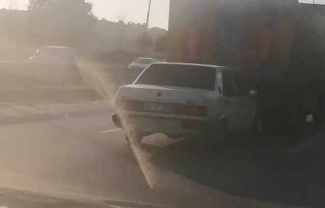 Bursa’da, otomobil sürücüsünün önündeki kamyonete takip mesafesini sıfıra indirerek, trafiği tehlikeye soktuğu anlar, başka bir sürücü tarafından cep telefonu kamerasıyla görüntülendi.