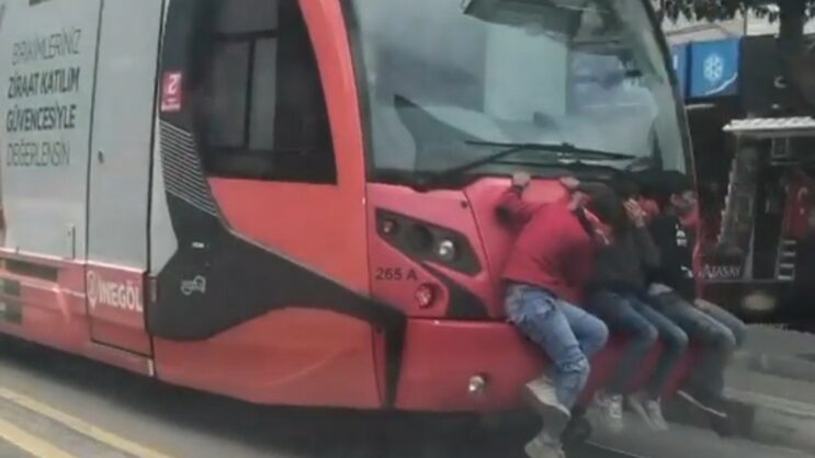 Küçük çocuklar düşme pahasına tramvayın arka kısmına tutunup yolculuk etti. Yoldan geçen otomobillere ve vatandaşlara aldırış etmeyen çocuklar korku dolu anlar yaşanmasına sebep oldu. O sırada oradan geçen bir araç sürücüsü tehlikeli anları cep telefonuyla saniye saniye kayıt altına aldı.