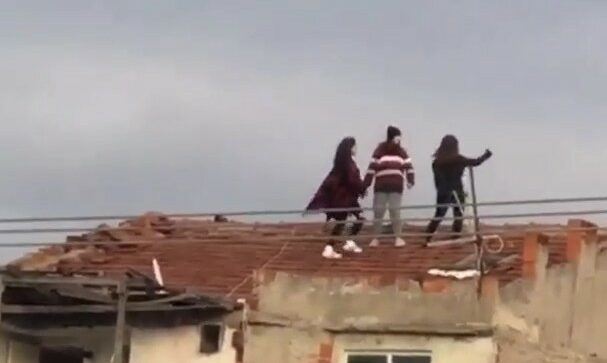 Bursa’da 3 genç kız, 4 katlı eski bir binanın çatısına çıkarak video çekti. Video çekmek için hayatlarını hiçe sayan gençler bir vatandaşın cep telefonu kamerası ile görüntülendi. Binanın ve çatısının eski olduğuna aldırmadan rahatça çatıda gezen genç kızlar, bir süre sonra bulundukları yerden inerek gözden kayboldu.