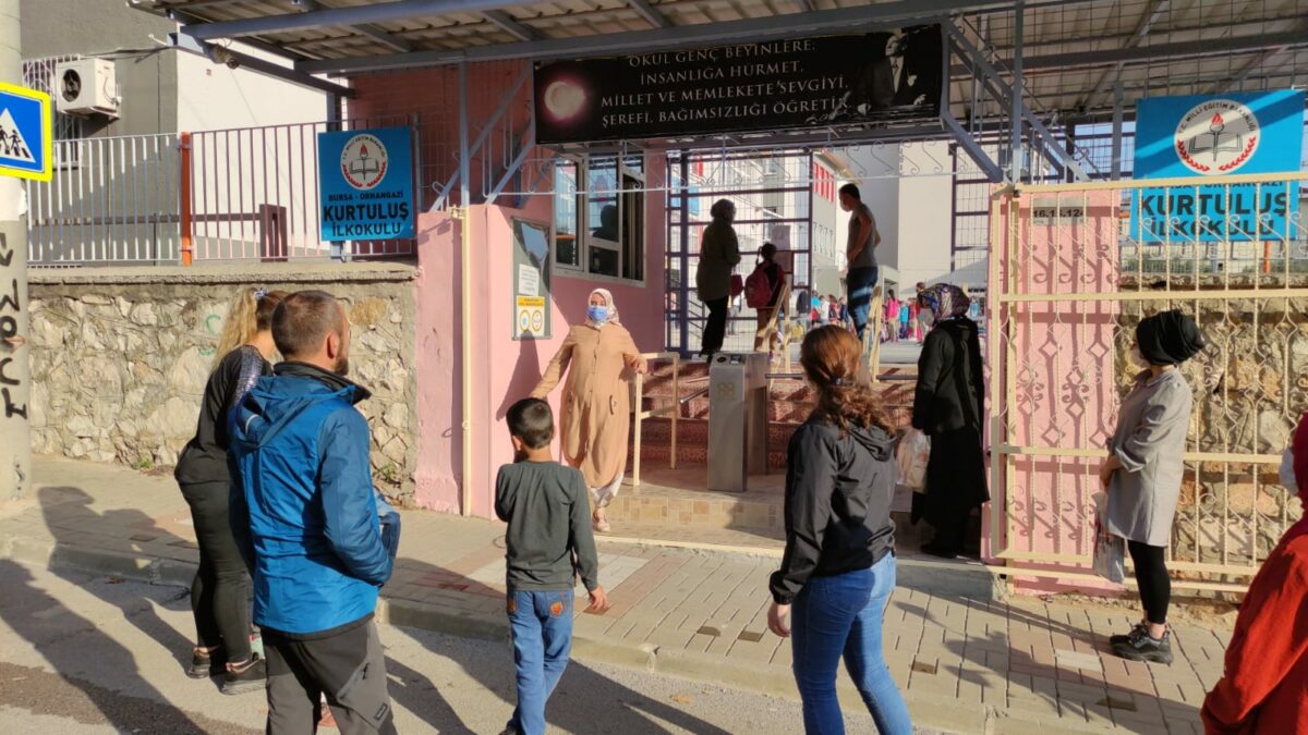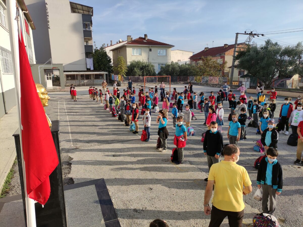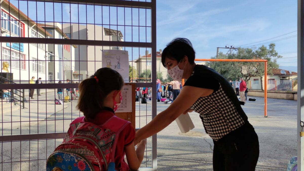İkinci aşama kademeli eğitimin başladığı okullardan Orhangazi Kurtuluş İlkokulu’nda törenden sonra öğrenciler tek tek ellerini dezenfekte ederek, sosyal mesafe kuralına uygun olarak sınıflara alındı.