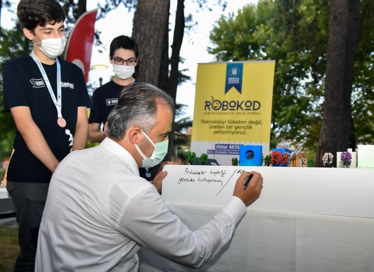 Festivalde dereceye giren öğrencilerle Merinos Parkı’nda bir araya gelen Bursa Büyükşehir Belediye Başkanı Alinur Aktaş, projeler hakkında bilgi alarak gençleri tebrik etti. Maddi manevi her anlamda güçlü olmanın muasır medeniyetler seviyesine çıkmanın ana göstergesi olduğunu söyleyen Başkan Aktaş, Türkiye’nin gerekli hamleleri genç nesillerle birlikte attığını belirtti. Teknofest’in bu manada önemli açılımlardan olduğunu ifade eden Başkan Aktaş, 2022’de Teknofest’in Bursa’da düzenlenmesini arzuladıklarını dile getirdi.