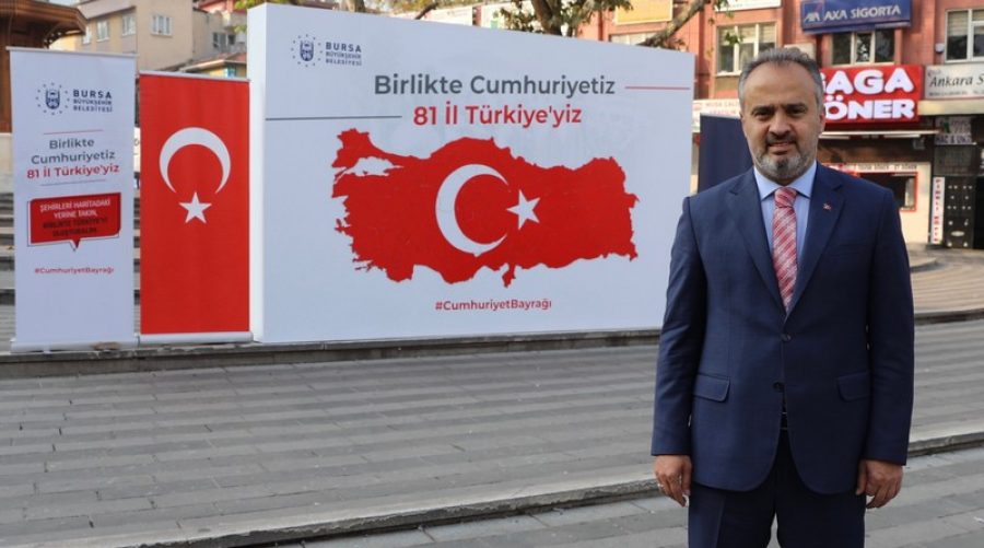 Cumhuriyet’in 97’inci yıldönümünün tüm Türkiye’de olduğu gibi Bursa’da da büyük coşkuyla kutlandığını söyleyen Büyükşehir Belediye Başkanı Alinur Aktaş, “Cumhuriyetin banisi Mustafa Kemal Atatürk ve silah arkadaşlarına minnetle ve rahmetle anıyorum. Birlikte Cumhuriyetiz, 81 il Türkiye’yiz” dedi.