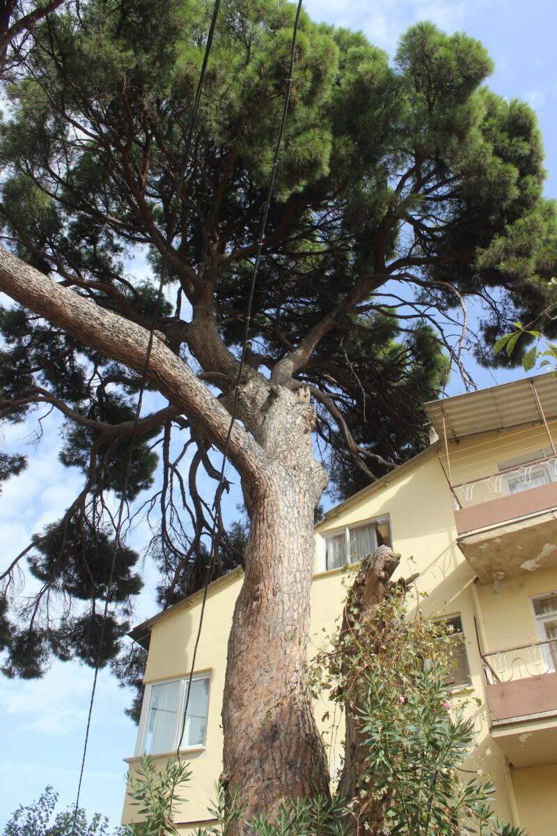 Çam ağacının hikâyesini anlatan Karacaali Muhtarı Göksel Noca, “İstiklâl Savaşı’nda İngiliz denizaltısı tarafından atılan torpidoyla bu çam ağacı vurulmuş. Aldığı darbeyle devasa büyüklükteki çam ağacının yarısı koparken, yarısı ayakta kalmış. Çam ağacının o gün aldığı darbenin izini görmek mümkün. Aldığı darbeye rağmen 100 yıldır ayakta. Biz ona gazi çam ağacı unvanını verdik. Bir de tabelâ astık. Hikâyesini duyan görmeye geliyor” dedi.
