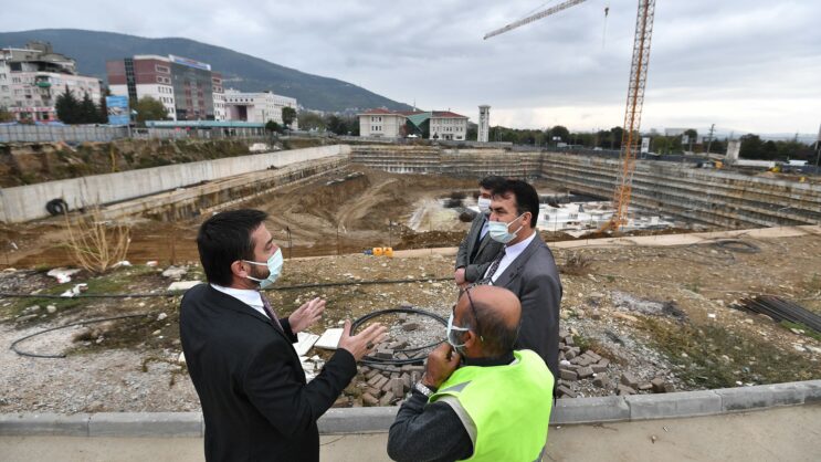 Başkan Dündar, makamdaki ziyaretin ardından Kestel Belediye Başkanı Önder Tanır’a Osmangazi Meydanı şantiyesini gezdirdi. Şantiye alanında dev meydan inşaatı hakkında bilgiler veren Başkan Dündar, Tanır’ın proje hakkında merak ettiği soruları da cevapladı. Dündar, “Önder Başkan, mimar olduğu için inşaat işlerini çok iyi bilen birisi. Hem belediye başkanı hem de bir mimar olarak Osmangazi Meydanı’ndaki inşaat çalışmalarını gelip görmesini istedik. 1,5 yıldır sürdürdüğümüz hafriyat çalışmalarını tamamladık. Zemin kotuna inerek temel için beton dökmeye başladık. Bundan sonraki süreçte inşaat daha da hızlanacak. Şimdiye kadar yerin altına doğru bir çalışma yaptık. Artık inşaat yukarı doğru çıkacak” diye konuştu.