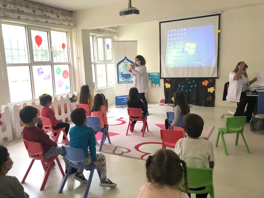 100. Yıl Anaokulu’nda ağız ve diş sağlığı, beslenme ve hijyen konularına değinilen eğitimde özellikle ağız ve diş sağlığının önemi, diş fırçalama tekniği ile ağız ve diş sağlığı için doğru beslenme konularına yer verildi. Doğru diş fırçalama tekniğinin diş maketi üzerinde uygulamalı olarak gösterildiği eğitimlerde, çocukların diş fırçalama konusunda farkındalık düzeyleri de ölçüldü.