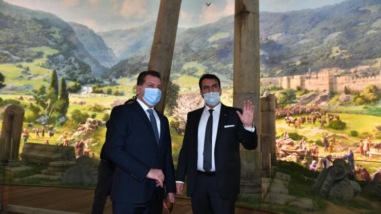 Osmangazi Belediye Başkanı Mustafa Dündar, müzenin mimari ve teknik özellikleri hakkında konuklarına bilgiler vererek dev eseri gezdirdi. Müze ziyaretine ilk olarak kubbe bölümünden başlayan Yılmaz, Bursa’nın 23 yıl süren kuşatma sonunda kan dökülmeden el değiştirdiği tarihi buluşma gününü tasvir eden panoramik resmi dikkatlice inceledi.