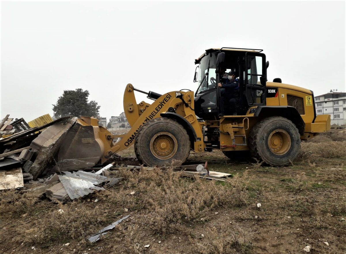 Osmangazi Belediyesi, Geçit ve Hamitler Mahallesi’nde boş arazi üzerine kaçak olarak yapılan ahır, kümes ve barakaları yıktı.