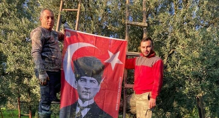 Bursa’nın İznik ilçesinde çiftçiler, sabahın erken saatlerinde zeytin toplamaya başladı. Saatler 09.05’i gösterdiğinde işi bırakan yaklaşık çiftçiler ellerindeki Türk bayraklarıyla Atatürk için saygı duruşunda bulundu.