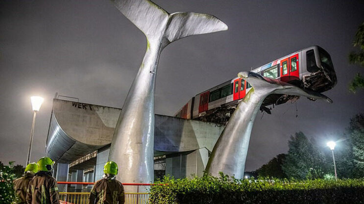 Hollanda’da metro istasyonunda meydana gelen kazada bakım için boş sefer yapan tren duramayarak bariyeri aşarak, 7.5 metre yükseklikteki dev balina heykeline çarptı.