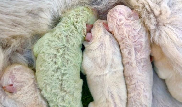 İtalya’da bir çiftlikte doğum yapan köpeğin 5 yavrusundan biri açık yeşil doğdu