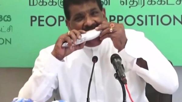 Sri Lanka’da eski Balıkçılık Bakanı Dilip Wedaarachchi , ülkedeki balıkların insanlara koronavirüs bulaştırmayacağını kanıtlamak için basın toplantısı sırasında çiğ balık yedi.