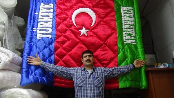 Tokat’ta 28 yıldır yorgancılık yapan Tamer Oruç (40), Azerbaycan ve Türk bayrağı temalı yorgan dikti. Oruç, diktiği yorganı Azerbaycan Kızılayı’na 5 bin lira üzerinde bağış yapan kişiye hediye edecek.