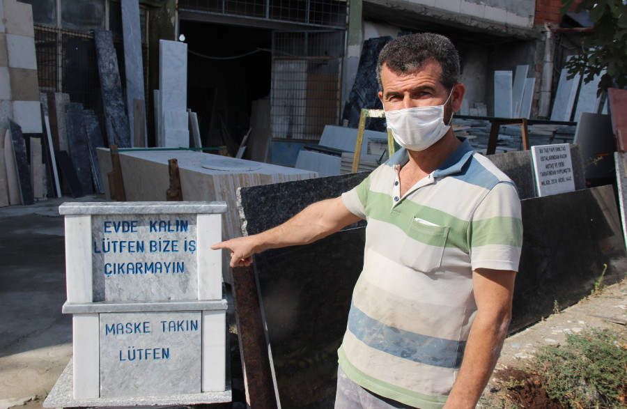 Artan vak’a sayılarını görerek insanlara ölümü hatırlatmak amacıyla hazırladığı mezar üzerine “Evde kalın lütfen bize iş çıkarmayın” yazan mermer ustası Zeki Tektaş, “Baktım herkes dışarı çıkıyor, yasaklara uyan yok. Böyle bir şey geldi aklıma. Gelenler görsün, dikkat çeksin diye. İnsanlar kendilerini düşünmüyorlar. Kendilerini bırak milleti düşünmüyorlar. Böyle bir şey düşünüp yazdım. Gerçekten dikkat çekti yani, insanlar gelirken arabayla giderken resim çektiler, baktılar, konuştular, sordular. Virüsten dolayı ölüm çok yakın bize, insanlar bunu bilsin diye böyle bir şey düşündüm. Zaten 25 senedir mermerciyim. Millet bu virüslü ortamda bize iş çıkarmasın. İnsanlar kendisine, karşısındakine dikkat etsin, hastalık bulaşmasın bunları amaçladık” dedi.