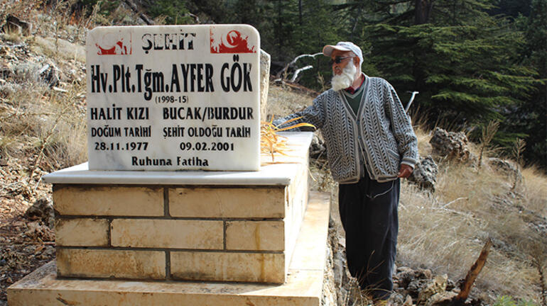Karaman’ın Ermenek ilçesinde çobanlık yapan Hikmet Demircan’ın (74), 2001 yılında askeri uçağın düşmesi sonucu şehit olan Pilot Teğmen Ayfer Gök’e ait olduğunu söylediği saç teli, küçük doku parçaları ve saat kordonunu gömüp yaptığı şehit mezarı, Ermenek Belediyesi tarafından çevre düzenlemesi yapılıp, yabani hayvanların zarar vermemesi için koruma altına alındı.