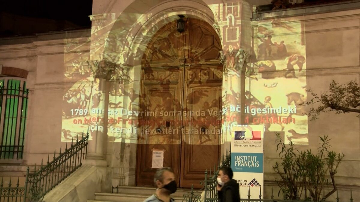 Taksim İstiklal Caddesi’nde bulunan Fransa İstanbul Başkonsolosluğu önüne gelen bir grup, İslam karşıtı eylemeler nedeniyle Fransa’yı protesto etti. Gruptakiler, yanlarında getirdikleri projektör ile başkonsolosluk binası duvarına Fransa tarihinde yer aldığı iddia edilen katliamlara ilişkin yazı, video ve fotoğraflar yansıttı.
