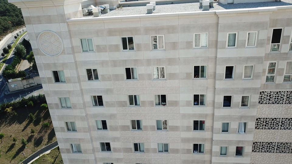 Karantinada olan vatandaşların sık sık odalarının camlarından baktıkları görülürken öğrenci yurdu havadan da görüntülendi.