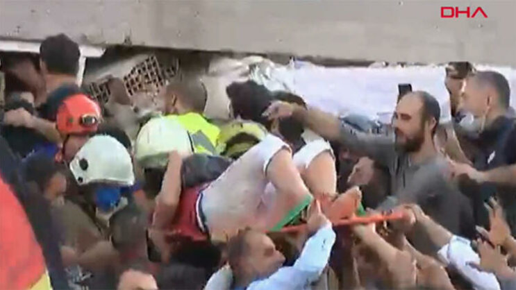 İzmir’in Bayraklı ilçesi 1593 Sokak’ta deprem nedeniyle yıkılan binanın enkazından 3 kişi yaralı kurtarıldı.