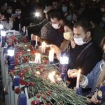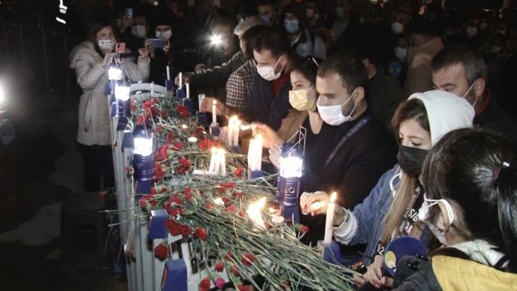 Onlarca kişi de akşam saatlerinde yıkılan apartmanın önüne geldi. Karanfillerin bırakıldığı alanda mumlar yakıldı.