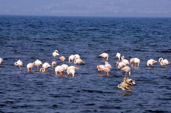 Bu sabah da bölgede yüzlerce flamingo denize indi. Sahilde sabah yürüyüşü yapan vatandaşlar, kıyıdaki flamingoları doyasıya izledi. Flamingolar renkli görüntüler oluşturdu.