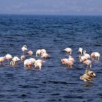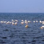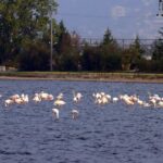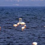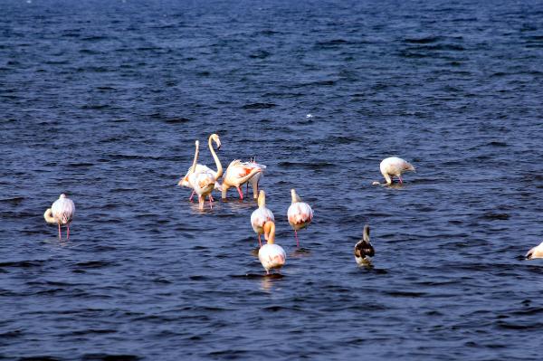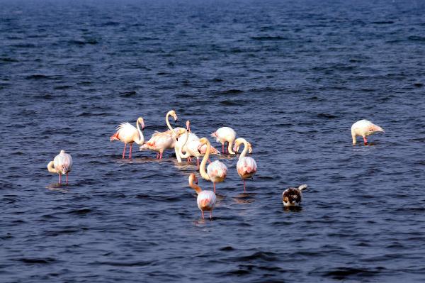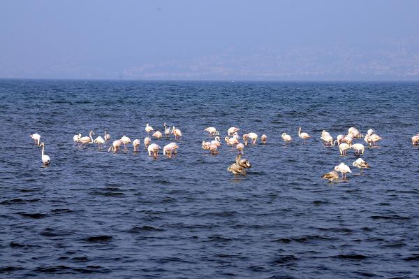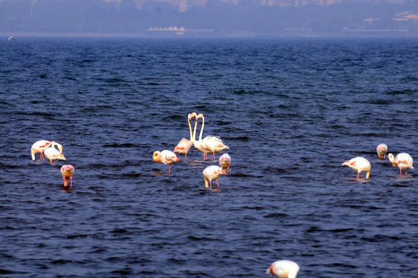 Bu sabah da bölgede yüzlerce flamingo denize indi. Sahilde sabah yürüyüşü yapan vatandaşlar, kıyıdaki flamingoları doyasıya izledi. Flamingolar renkli görüntüler oluşturdu.