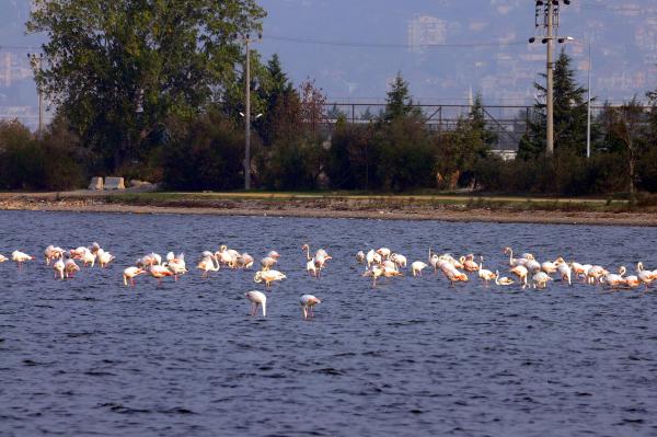 İzmit Körfezi’nde denize inen yüzlerce flamingo, renkli görüntüler oluşturdu.