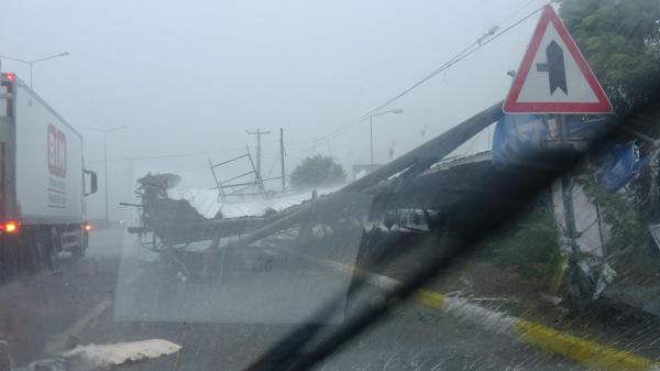 Balıkesir’in Edremit ilçesinde sağanak ile birlikte etkili olan fırtına sırasında bir iş yerinin yaklaşık 15 metre uzunluğundaki çatısı E-87 karayoluna uçtu. Karayolunda trafik akışı bir süre kontrollü olarak sağlandı.