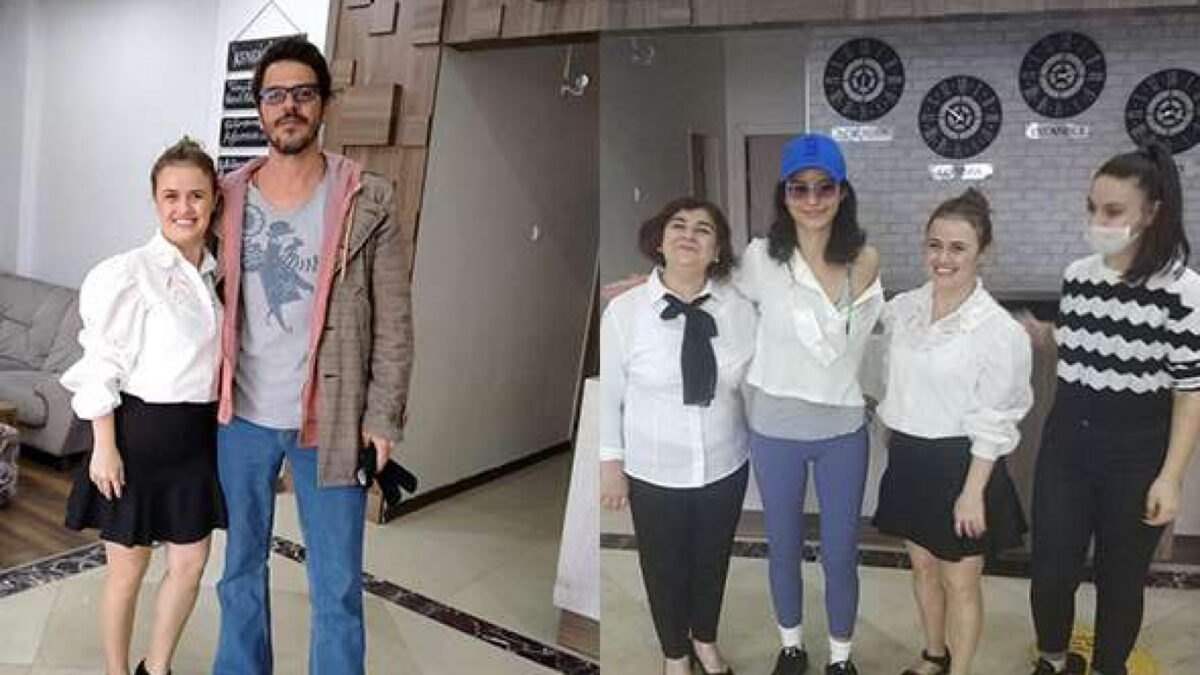 Oyuncular Mehmet Günsür ve Beren Saat, otel çalışanlarını kırmayarak hatıra fotoğrafı çekildi.