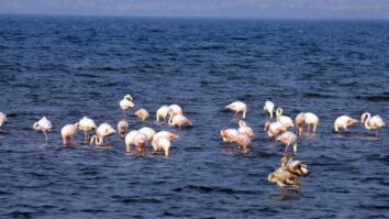 İzmit Körfezi’nde denize inen yüzlerce flamingo, renkli görüntüler oluşturdu.