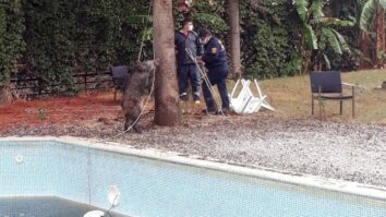 Muğla’nın Marmaris ilçesinde şehir merkezine inen bir domuz turistlerin yüzdüğü otel havuzunda mahsur kaldı.