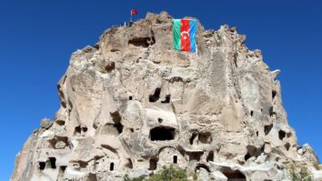 Uçhisar Kalesi’ne Türkiye- Azerbaycan’ın birlik beraberliğinin göstergesi olarak Azerbaycan bayrağı asıldı.